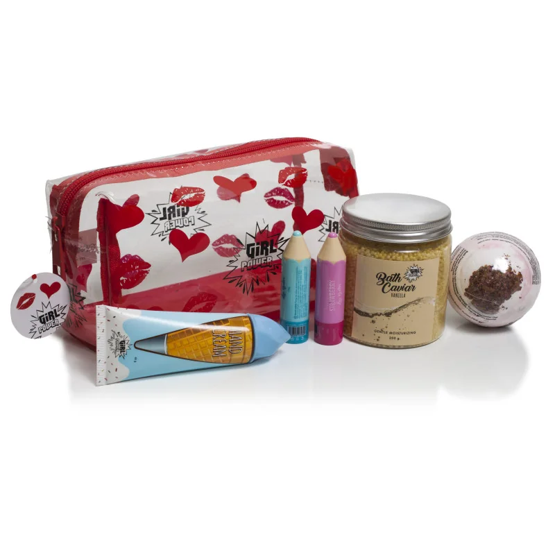SET GIRL POWER CON NECESER TRANSPARENTE, CON CREMA DE MANOS, CAVIAR DE BAÑO, DOS BALSAMOS LABIALES Y BOMBA DE BAÑO